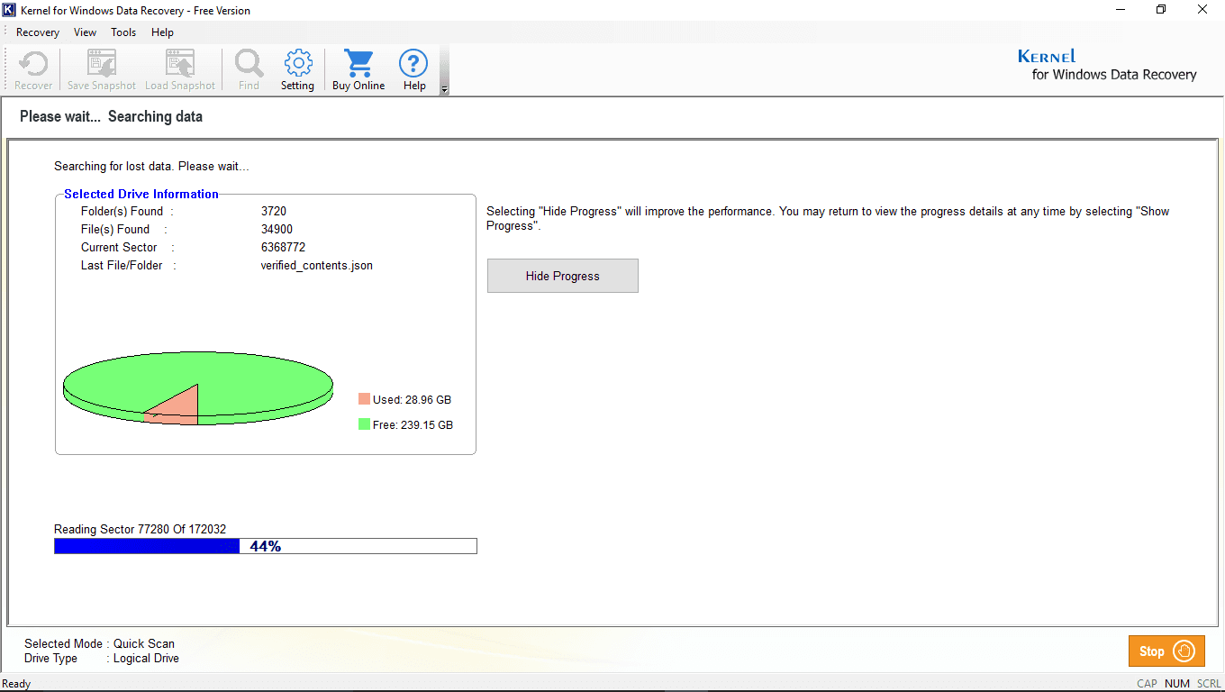After the analysis of the limitations of manual approaches, do consider an effective and secure tool to recover data from flash drive. Kernel for Windows recovery tool is innovative software that extracts and recovers entire data from corrupt or lost partitions from disk drive. This Free Windows Data Recovery software is simple and easy to use. It quickly recovers corrupt files, folders, images, videos, audio, applications, databases, everything present in the drive. Some other key features are: