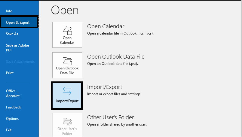 - In the File menu of Outlook, click Open & Export > Import/Export.