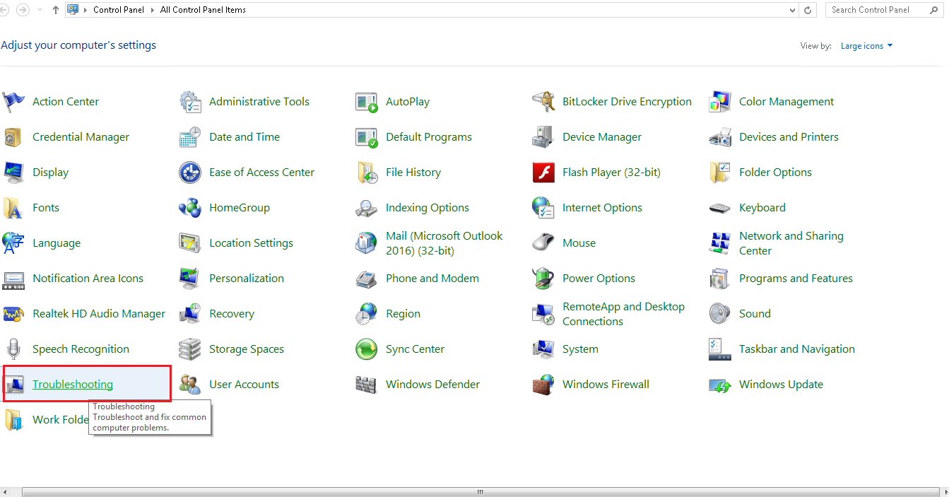 - Click on the Troubleshooting option from the Control Panel Items.