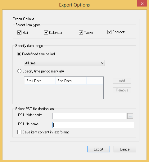 Step – 5: In the Export Options wizard there are multiple filters which you can use to migrate only the desired data. You can select various item types, input a date-range, browse a destination folder and provide a name. Click Export after filling the required fields.