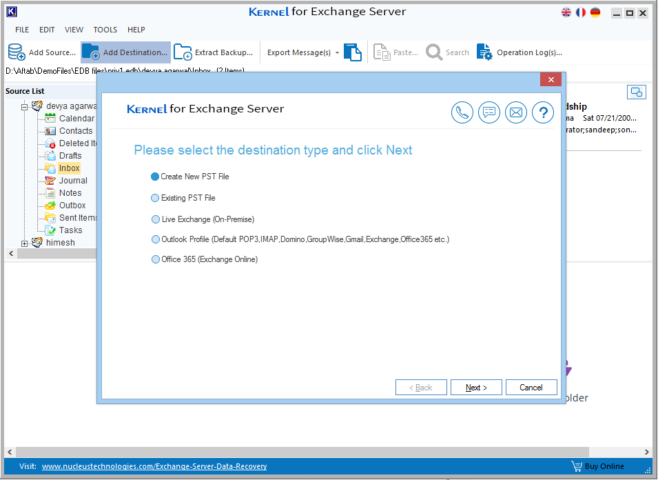 - Now, to save the EDB file content, you may choose from multiple destinations like a PST file, live Exchange, Outlook profile, Office 365, and a public folder.