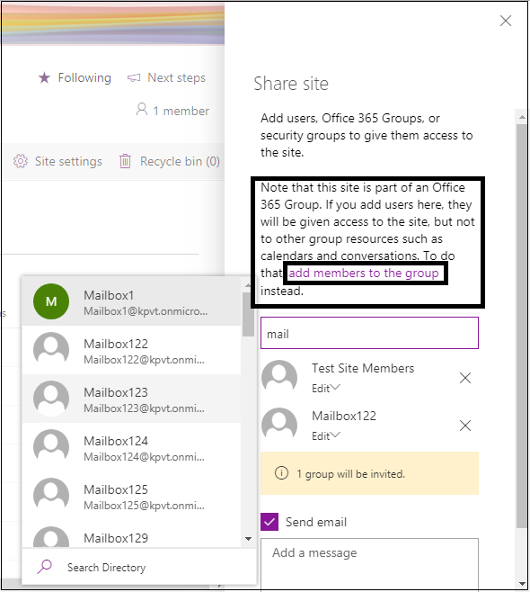 Note: If the site is part of the Office 365 group, the added users would get access to this Office 365 group site only and no other Group resources (calendars and conversations).