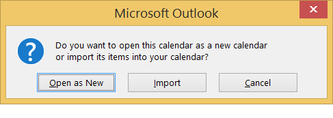 - The Outlook is asking either to open the calendar as a new calendar or import its items into your calendar. Click Open as New to see the calendar separately or Import to see its entries in the existing calendar.