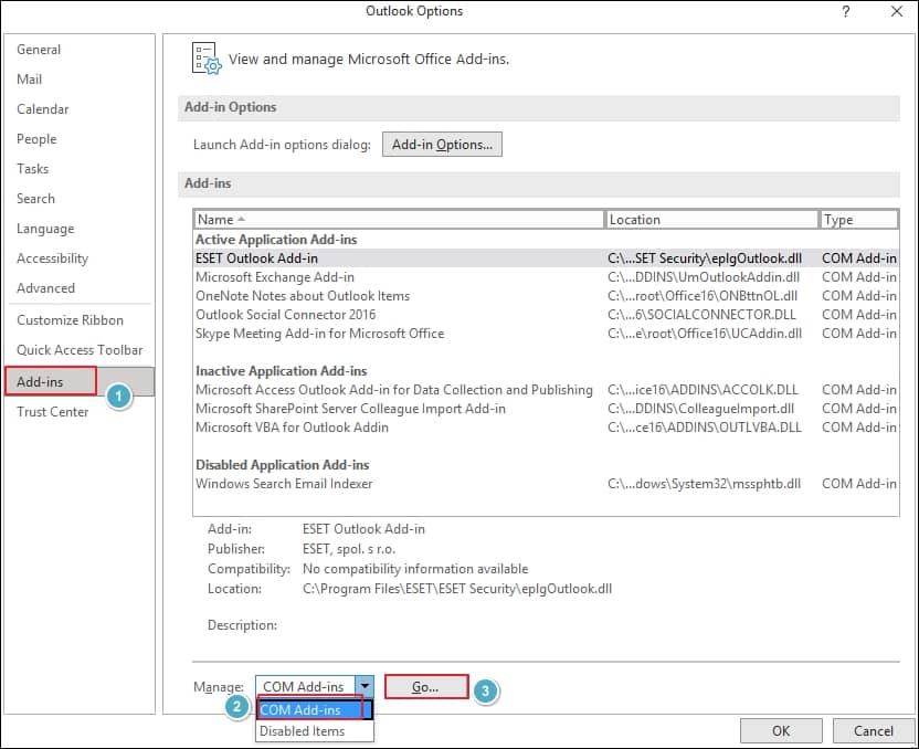 One common issue is conflicting add-ins in Outlook. To resolve this, disable these COM Add-ins options in the Outlook application. Here’s how: go to the File option in Outlook, then click on Options. This will open a wizard, select Add-ins, then go to Manage>COM Add-ins>Go. Here, you can disable add-ins one by one and detect incompatible ones.
