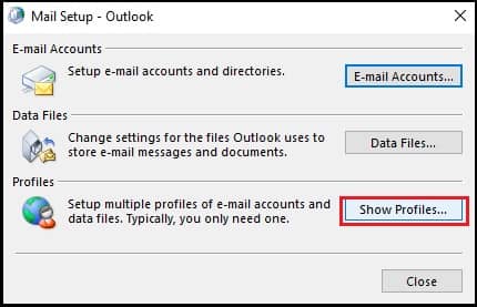 - After opening Mail from the Control Panel, click on Show Profiles.