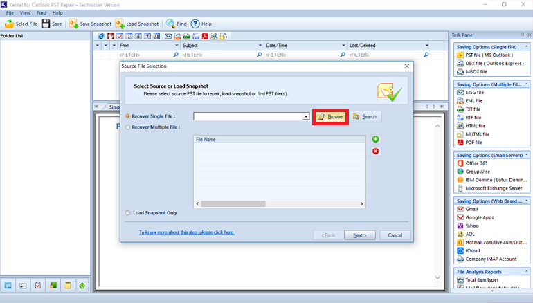 - Click on the Browse option to add PST files from the system drive location or you can repair multiple PST files together.