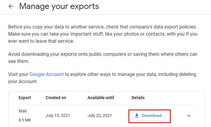 Step 4: Open the mail and select Download your files which will work for the next seven days. Extract the ZIP file, which will be available in MBOX format. Import this MBOX file in the supported mail application and view the mail along with its attachment data.