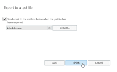 - After making a selection, click Finish to start the PST export on Exchange 2010 mailbox server. Once the process is complete, you will receive an email from Exchange.