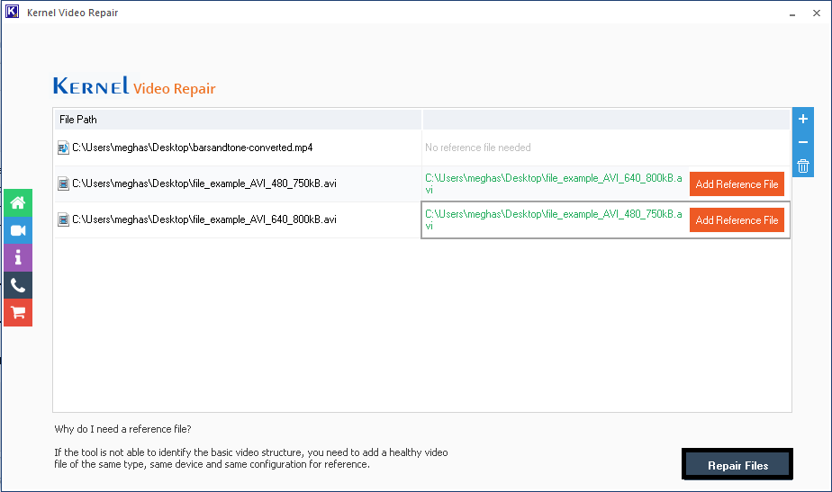 - You can include the chosen video files by selecting them. If any of the video files are corrupted, you will need to add a reference video that is in good condition and has the same structure. To do this, simply click on “Add Reference File.” Once all the reference files are added, click on “Repair Files” to initiate the repair process.