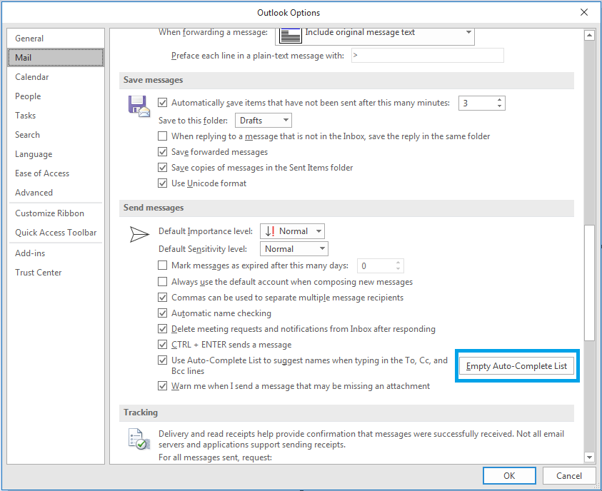 In the Outlook Options dialogue box, select Mail from the category and locate Send Messages from the category details, and click on the Empty Auto-Complete List. As you click on this option, all the Auto-Complete history will be cleared, and you can start from all new emails. Click on OK while leaving.