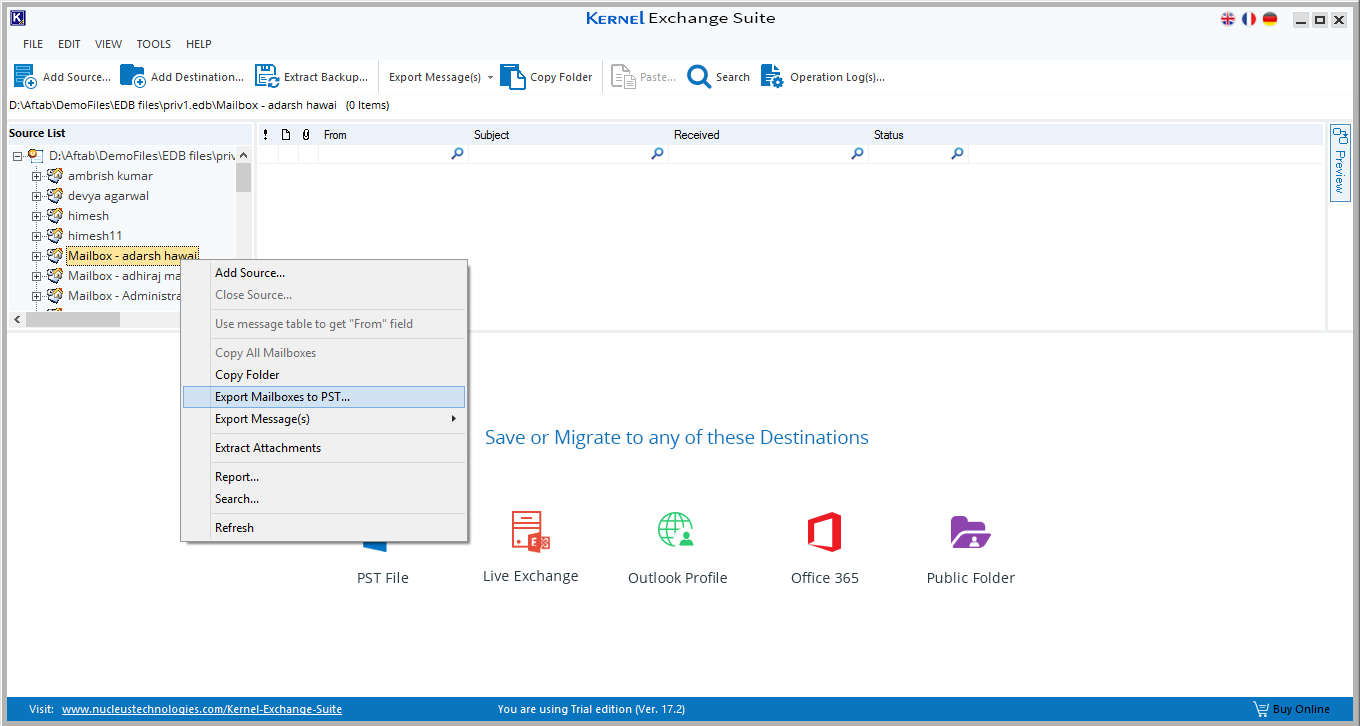 Kernel Exchange Suite helps you migrate data from a source (EDB file, live Exchange, Outlook profile, Office 365, public folder, OST file, PST file) to a destination (New PST, existing PST, live Exchange, Outlook profile, Office 365, public folder) in different ways.