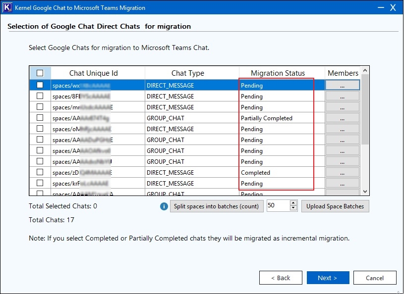 G. If any of the direct messages spaces was finished migrating or aborted earlier, user can view its status under the Migration Status column stating whether it was partially completed or fully completed. Next time when user try remigrating same spaces, it will only migrate recent items added after last migration.