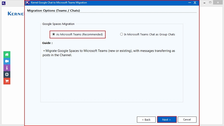 Kernel Google Chat Migration software allows users to migrate Google Chat and Spaces into Microsoft Teams Chat and Microsoft Teams. It easily migrates Google Chat (Direct Messages) to Microsoft Teams Chat and Google Spaces of all organization and only selected users to Microsoft Teams Chat as Group Chat or Microsoft Teams.