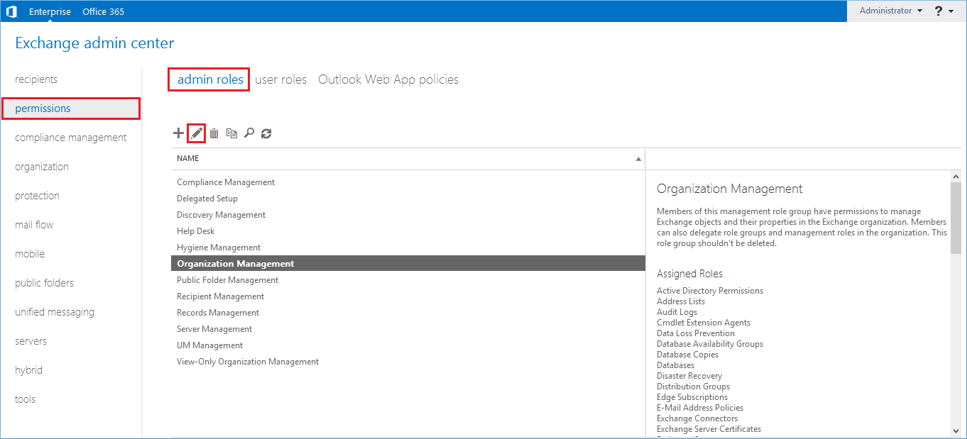 Step 2. In the permissions category, go to admin roles, and then select the category of Organization Management. Finally, click the Edit button.