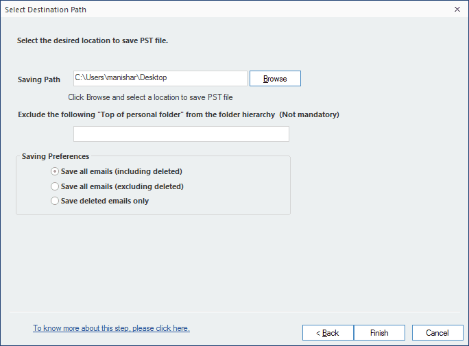Note: During the recovery process, when you reach the ‘Select Destination Path’ window ensure to select ‘Save deleted emails only’ under the ‘Saving Preferences’ section. This will make sure the recovery of deleted emails from the PST file.