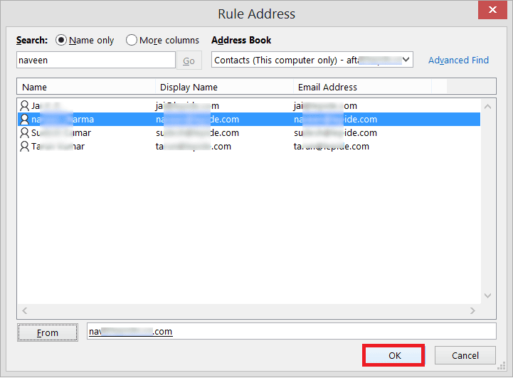 Choose the contact that you have chosen for the Rule. Then click OK.