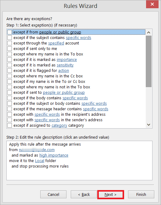The next page in Rules Wizard is for exceptions that you can apply on Rule. If there are no exceptions, you can leave all the boxes unchecked. Then click Next.