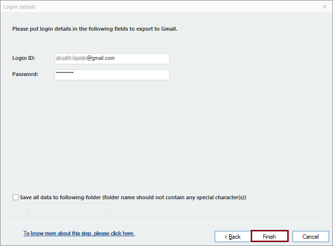 Step 9: In the Login Details window, enter Gmail credentials, like Login ID and Password. Click Finish.