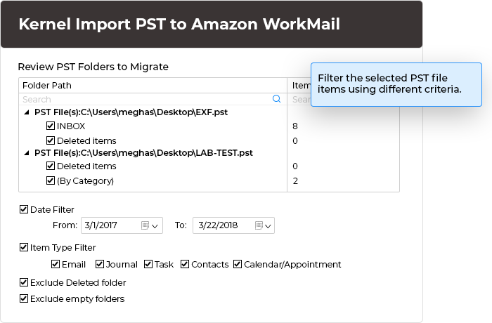 Robust filtering options enable a tailored transfer of PST data to Amazon WorkMail. Users can choose various filters such as Date range, Item Type, Folder type, Exclude Deleted folders, Exclude empty folders & more.