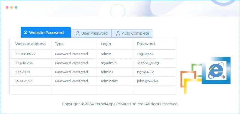 Kernel IE Password recovery tool is integrated with quick algorithms to recover password credentials.
