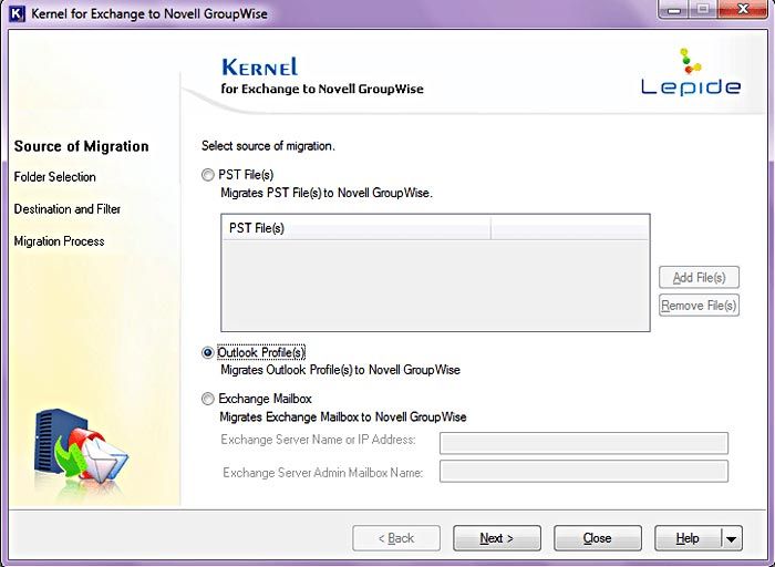 Step 4: Providing “Outlook Profile(s)” option to export Outlook profile(s) to Novell GroupWise