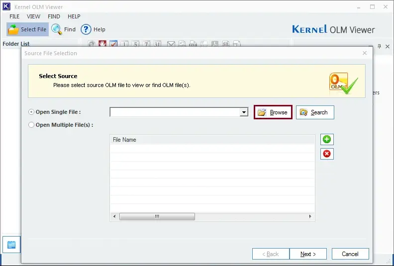 Step 1: Browse the OLM file that you want to open.