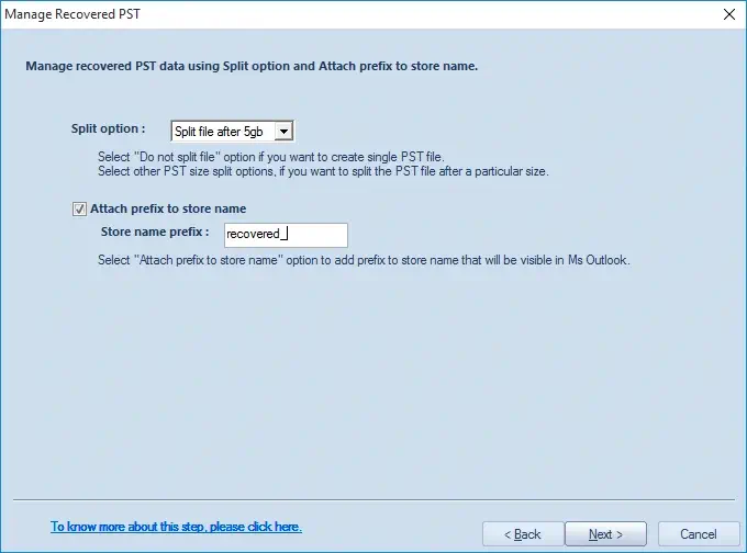 Step 9: Define the size to split or add prefix to the resultant PST File.