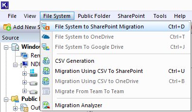 Step 5- Once both source and destination are connected, in toolbar click on "File System" option from tool bar and select File System to SharePoint from drop-down menu.
