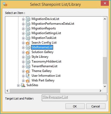 - Expand the list or subsites to go to the folder. After selecting the folder, click OK.