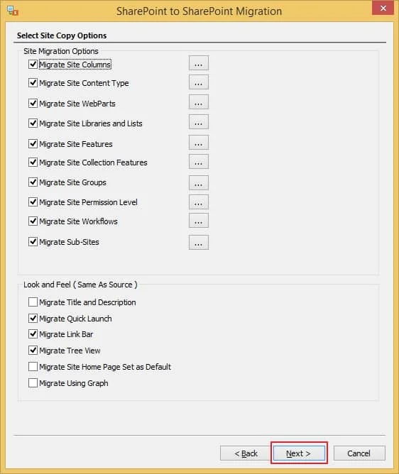 Step 14. Now select from the give Site Copy Options categorized as Site Migration Options and Look and Feel (Same As Source).
