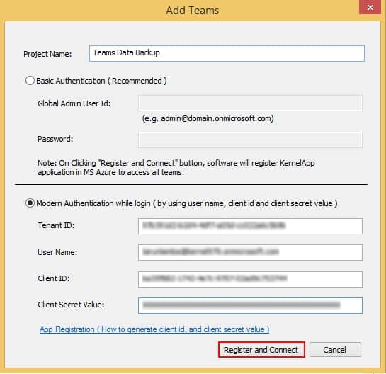 Step 4. In Add Teams window, enter Project Name, and select Basic or Modern Authentication for login accordingly. After that, click Next to map your Microsoft Teams account with the software.