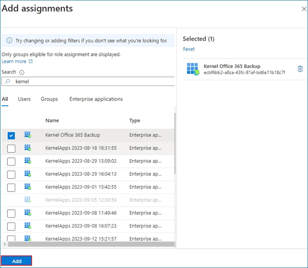 Step 5.4: When the name of the registered app appears, type its name, and choose it from the list. The app will then receive the Global Administrator role after you click the Add button.