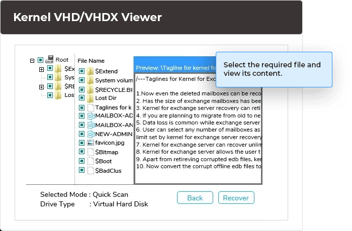 Free VHD Viewer tool helps you open and view the files and documents of even corrupt VHD/VHDX files including documents, media files, and database files.